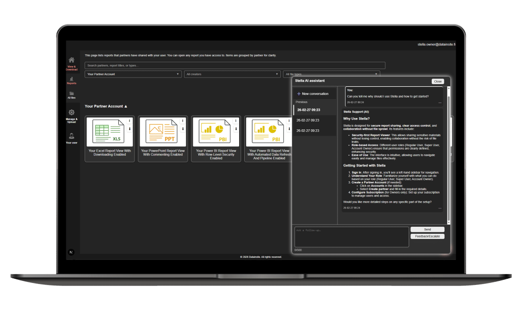 Stella enthält KI-gestützten Support, der Nutzern hilft, Funktionen zu verstehen, Freigabeeinstellungen zu verwalten und häufige Fragen schnell zu klären. So können sowohl interne Teams als auch externe Partner die Plattform effektiv nutzen, auch wenn es um sensible oder ungewohnte Inhalte geht.